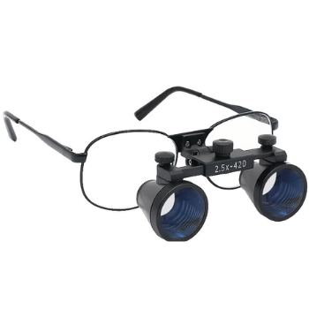 Lentes de vidrio con ampliaciones de 2.5x o 3.5x y distancia focal de 30 a 42 centímetros.